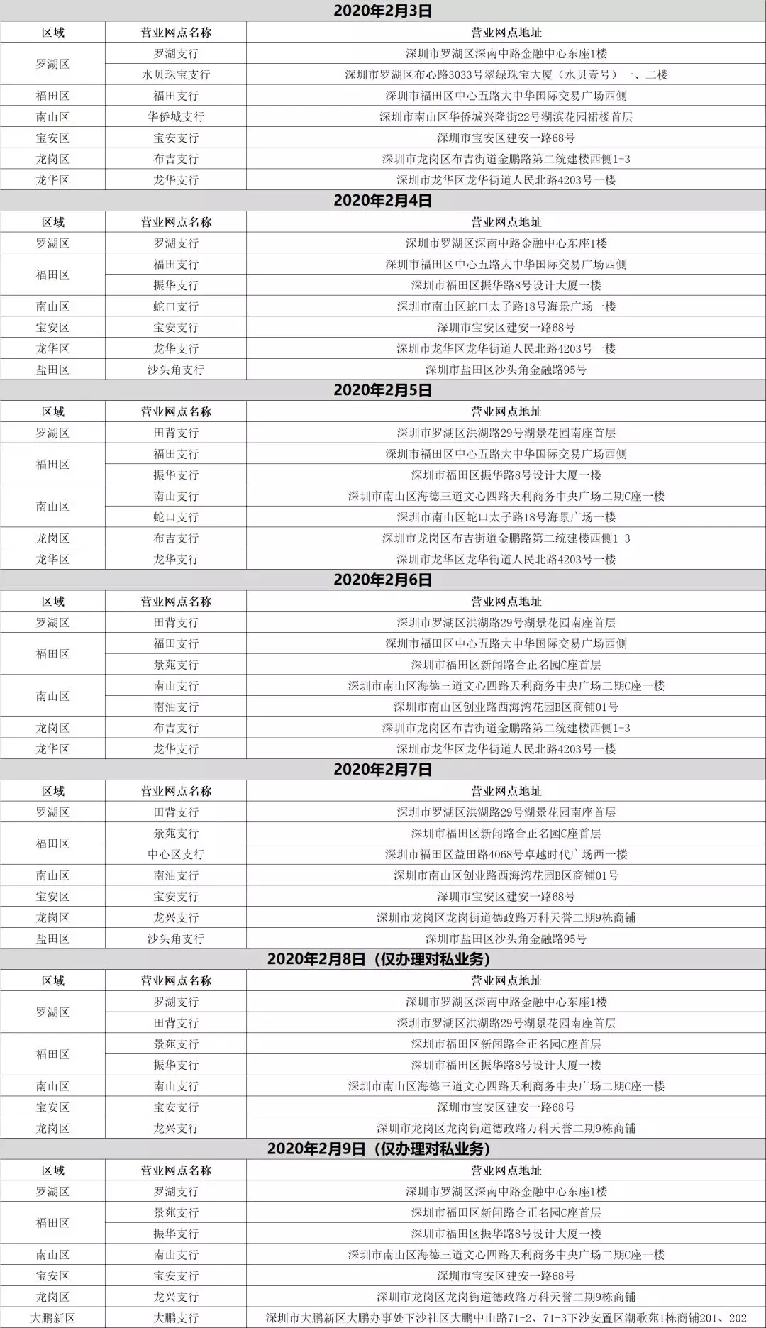 您好!依据国务院决策部署,根据《广东省人民政府关于企业复工和学校开学时间的通知》要求,为全力做好新型冠状病毒感染的肺炎疫情防控工作,建设银行深圳市分行调整2月3日至2月9日对外营业网点安排,具体通知如下: