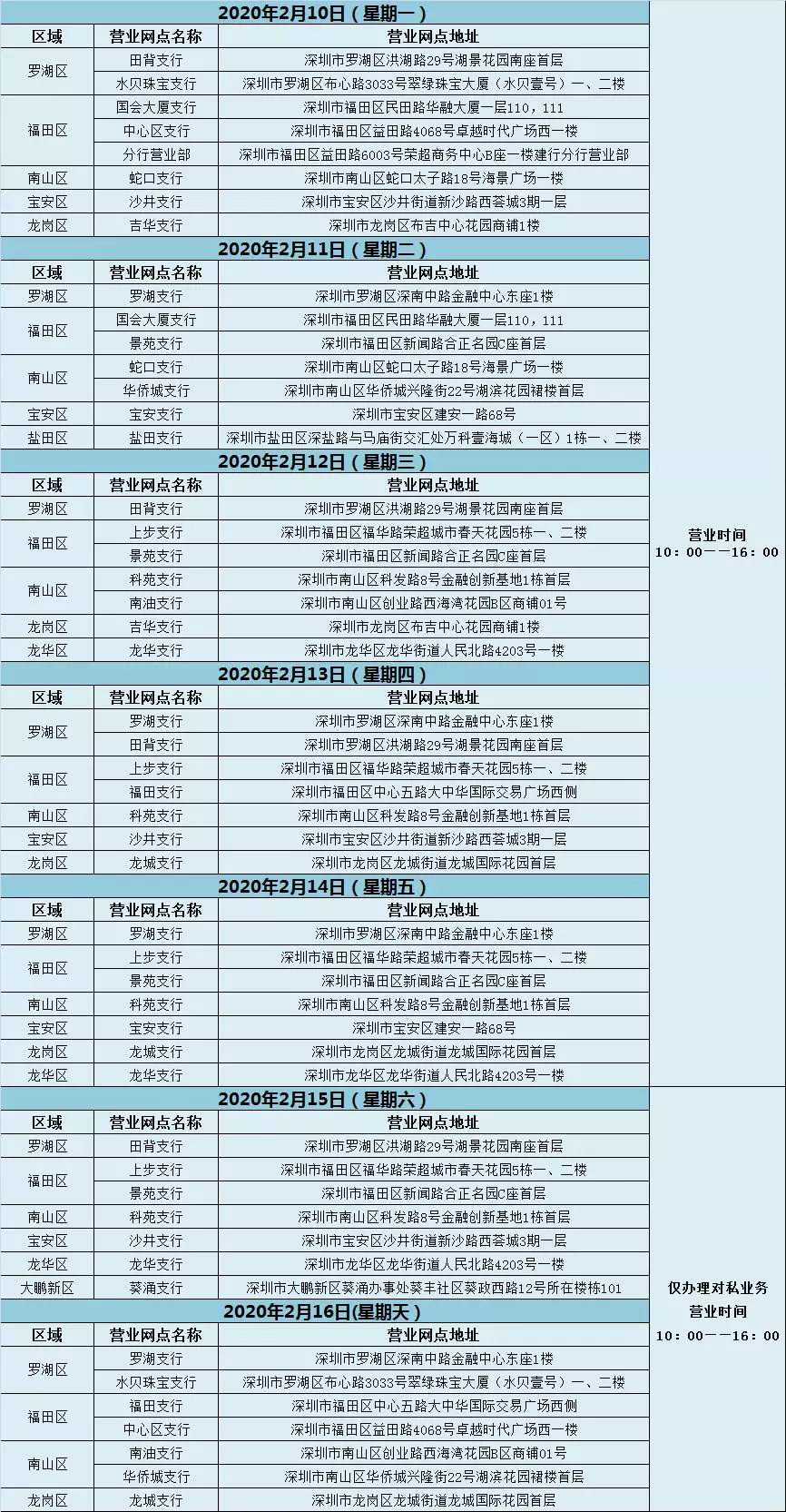 一、对公业务营业时间2月10日-2月14日10:00-16:00;对私业务营业时间2月10日-2月16日10:00-16:00。